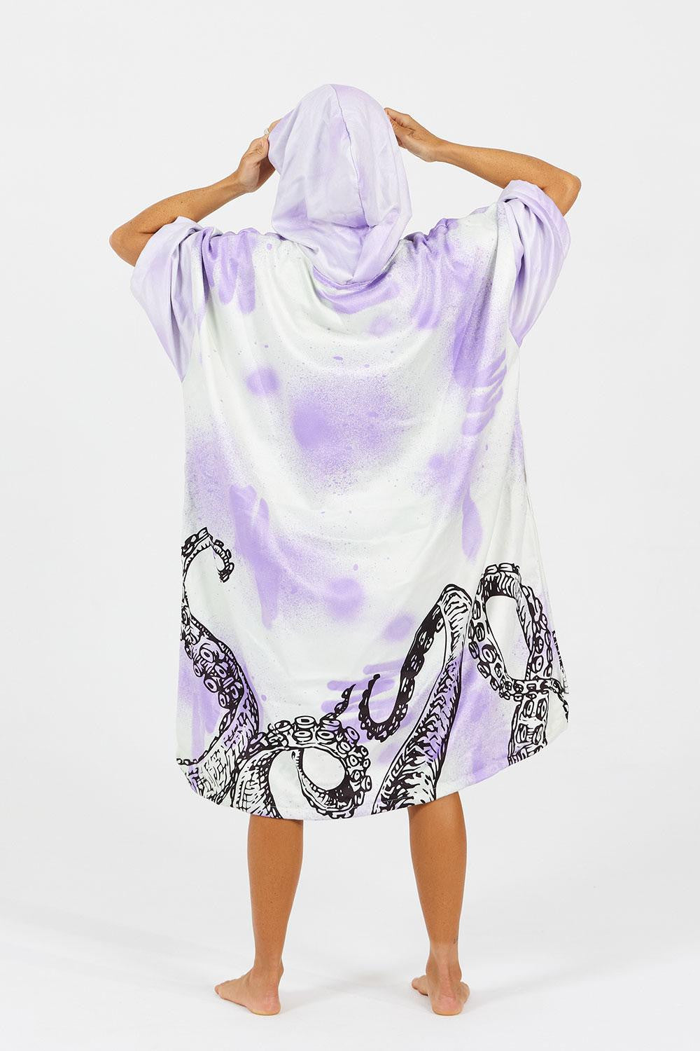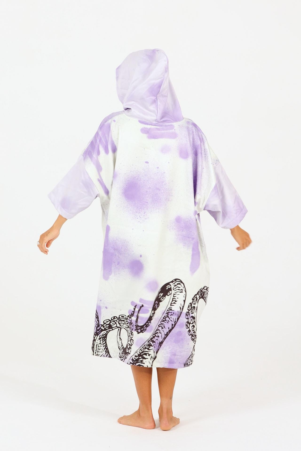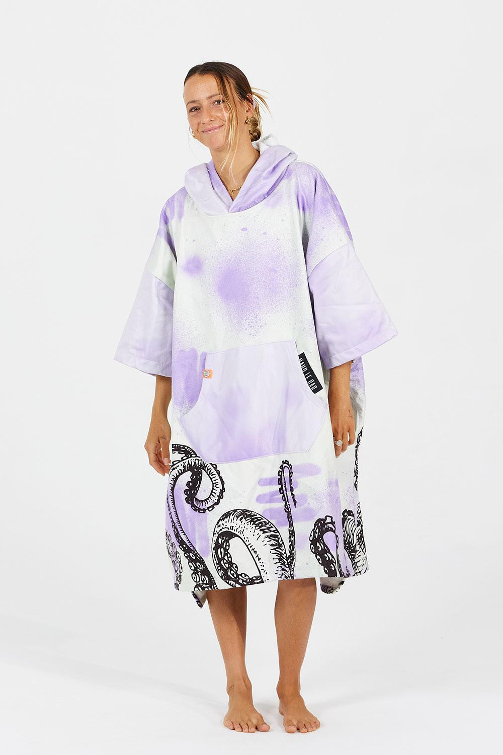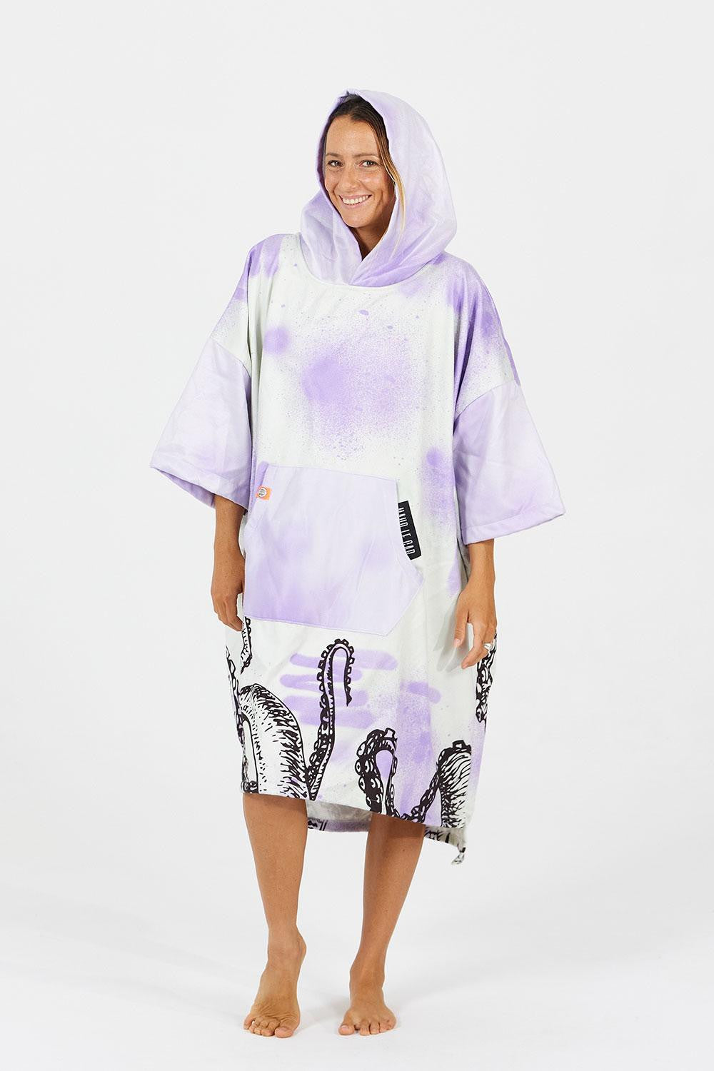 Notre collaboration avec notre fantastique ambassadrice Maud le Car continue avec cette deuxième création. Un design entièrement imaginé par la surfeuse avec des manches plus longues pour plus d’intimité et de confort après ses sessions, une capuche plus grande pour bien se sécher les cheveux, une poche kangourou pour pouvoir collecter quelques déchets en partant de la plage et de nouveaux motifs inspiré de ses dernières créations artistiques. Depuis quelques années Maud s’est largement investie dans la lutte contre la pollution plastique des océans. Son engagement se retrouve également dans ses créations artistiques mettant en scène diverses créatures marines, des pieuvres dansent sur le tissu éponge ultra absorbant et contraste avec les teintes mauves propres à l’univers graphique de Maud.